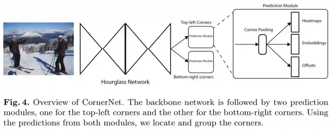 骨干网络使用hourglass网络,其后是两个预测模块,一个负责预测左上角,一个负责预测右下角。每个模块内都有自己的corner pooling层,池化之后预测热图,嵌入向量和偏移。CornerNet仅适用最后一层进行预测,没有使用不同尺寸的feature map来预测不同大小的目标。