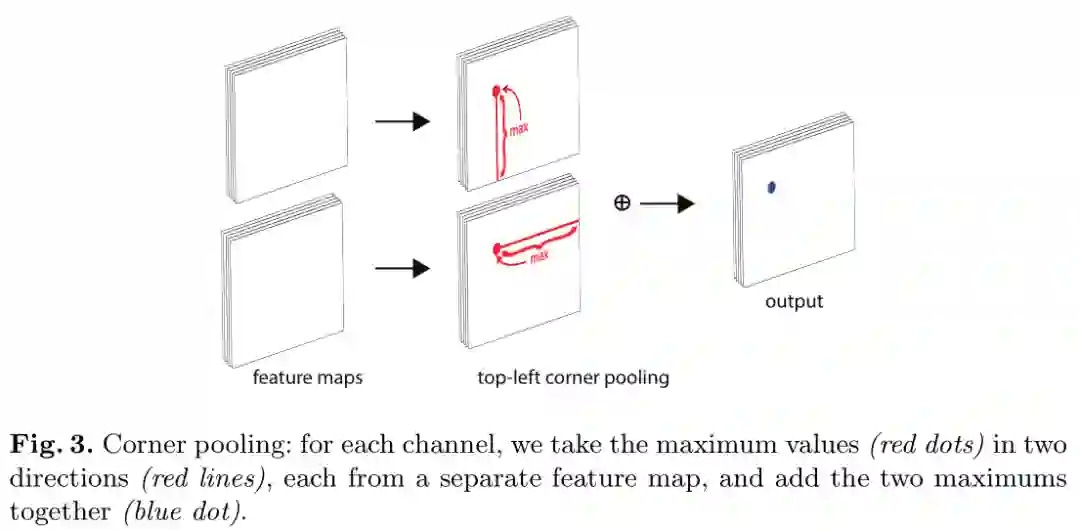 CornerNet中提出了一个corner pooling层,帮助网络更好的定位bbox的两个角。因为bbox的两个角通常在目标区域之外,如下图所示: