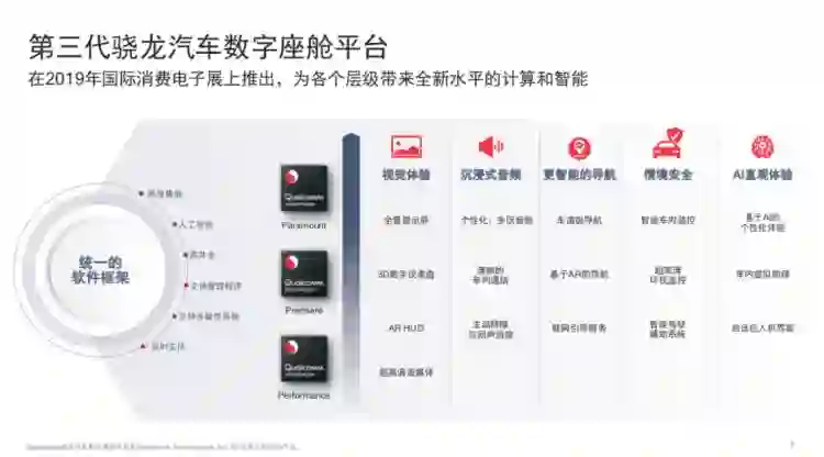 在CES 2019开展前夕,高通宣布推出第三代Qualcomm骁龙汽车数字座舱平台(Qualcomm Snapdragon Automotive Cockpit Platforms),该平台也面向了不同的三个等级:面向入门级的Performance系列、面向中端的Premiere系列以及顶级计算平台Paramount系列。