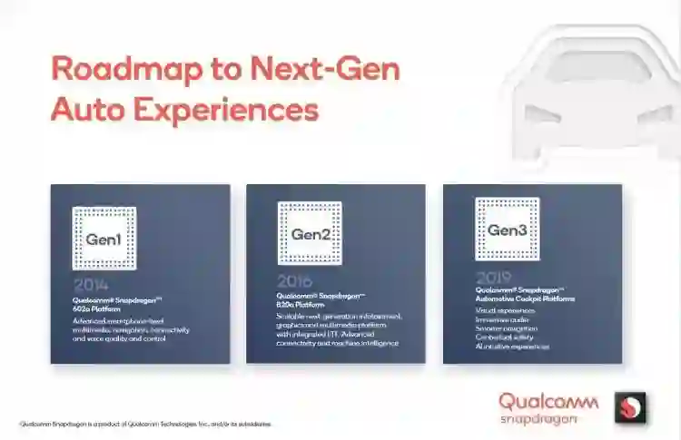 如果我们将目光放到车内,这将是一套更注重体验的车载娱乐系统。而在你的智能座舱之下,将是一套专门为汽车打造的芯片平台。在2014年、2016年以及2019年,高通已经分别推出了三代Qualcomm骁龙汽车数字座舱平台。