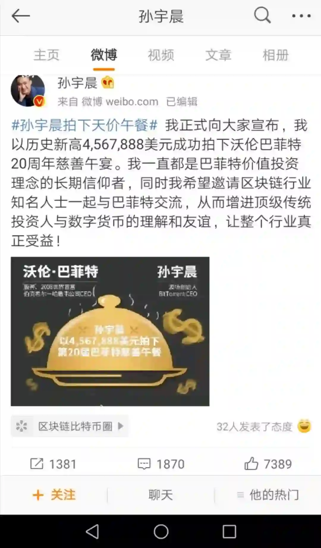 今日凌晨,微博认证为马云湖畔大学首期学员、陪我APP董事长兼CEO的孙宇晨发布微博称,“以破纪录4,567,888美元成功拍下沃伦巴菲特20周年慈善午宴。”他同时还是区块链项目波场TRON创始人、BitTorrent CEO。