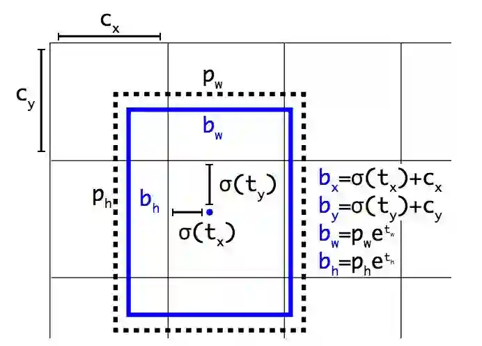 图 2:带有维度先验和定位预测的边界框。我们边界框的宽和高以作为离聚类中心的位移,并使用 Sigmoid 函数预测边界框相对于滤波器应用位置的中心坐标。