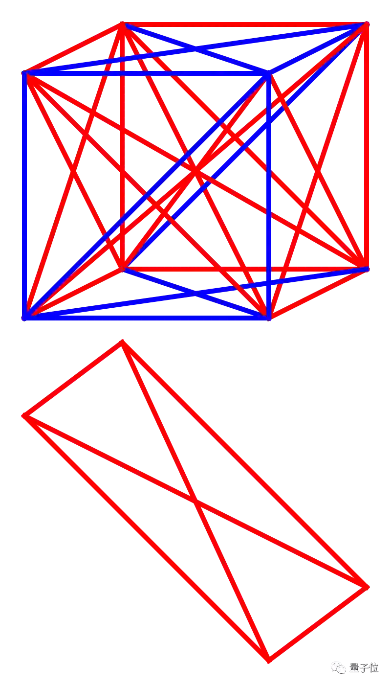 你注意到了吗?有一个斜的平面中有个单色完全图,可是如果我们把最下面的边换成蓝色,那么就不能在任意一个平面内找到单色完全图了。