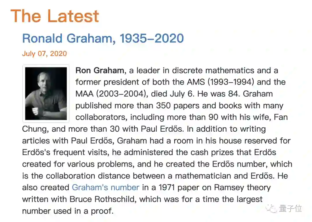 虽然很多数学爱好者不敢相信这个事实,但美国数学学会(AMS),已在官网发布了葛立恒的讣告: