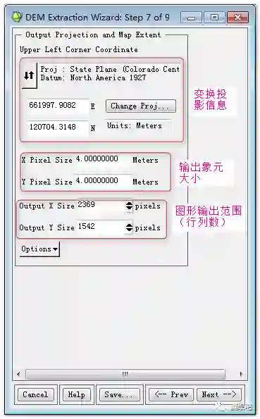 4)设置DEM提取参数和输出投影方式以及输出参数(图10)。