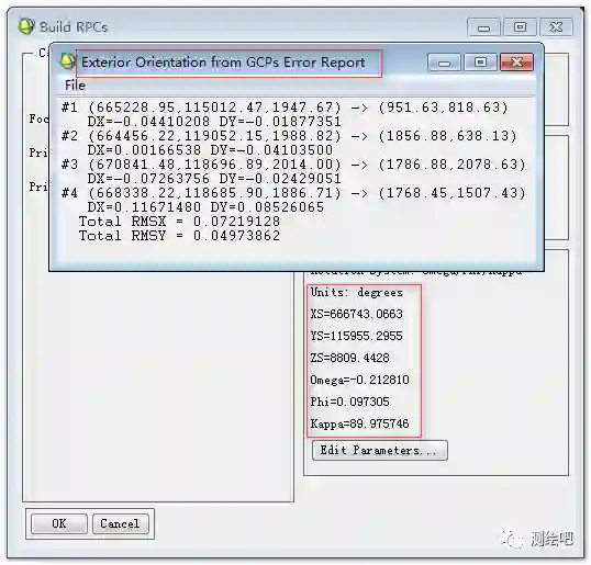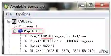 点击Select GCPs inDisplay按钮,弹出Select GCPs inDisplay对话框,设置地面控制点的投影信息(图4)。点击OK。弹出ExteriorOrientation GCPs窗口(图5)和图像显示的三窗口。在图像显示的三窗口中选择GCPs,并在ExteriorOrientation GCPs窗口(图5)中添加对应的地理坐标信息和高程信息。在选择合适数量的控制点后,在ExteriorOrientation GCPs窗口的Options菜单下选择Export GCPs toBuild RPCs Widget按钮,ExteriorOrientation GCPs窗口和图像显示的三窗口消失。最后点击BuildRPCs窗口中的OK按钮,出现外方位元素的误差报告(图6)。在波段列表中可以发现,原图像已经包含了地图信息(图7RPC文件自动的加载到影像的MapInfo信息中了。)