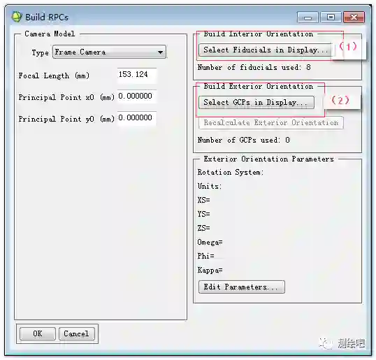 打开ENVI并加载需要构建RPC文件的两幅航空相片。在Map菜单下点击BuildRPCs,选择图像IMG1.。OK!弹出BuildRPCs的窗口(图1)。在该窗口的左栏中选择传感器类型:Frame (框幅式),输入焦距(FocalLength)和像中心点坐标x0,y0。