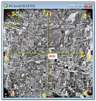 在BuildRPCs的窗口(图1)的右栏,点击Select Fiducialsin Display按钮,弹出InteriorOrientation Fiducials(内定向)窗口(图2)和图像显示的三窗口,在图像显示的窗口中分别找到各个框标点并输入相应的位置坐标,然后AddPoint,依次添加8个框标点的位置参数(图3)。然后在InteriorOrientation Fiducials窗口的Options菜单下选择Export Fiducialsto Build RPCs Widget按钮,InteriorOrientation Fiducials窗口和图像显示的三窗口消失。