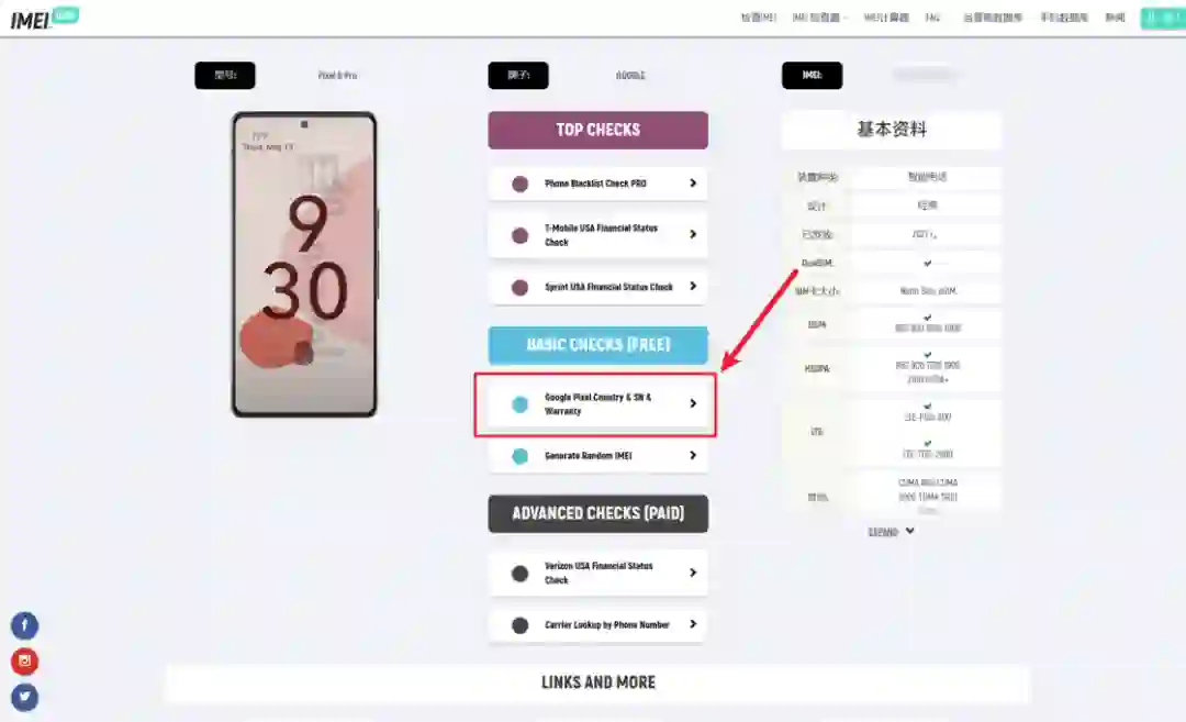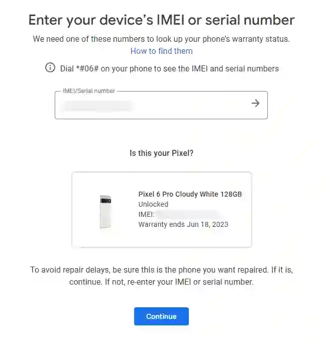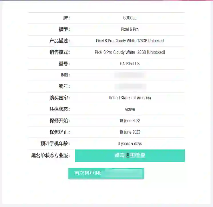 ,进一步验证该 IMEI 对应机型的购买地区和保修信息:在页面中输入 IMEI 后点击查询,如果设备 IMEI 所对应的购买区域和 Google Store 商店当前的页面区域一致,下方便会出现该设备对应的型号、参数和保修截止日期;如果你在输入 IMEI 后页面未能查询到信息,则需要与店家确认设备的实际区域版本,并切换该页面至对应区域重新查询。