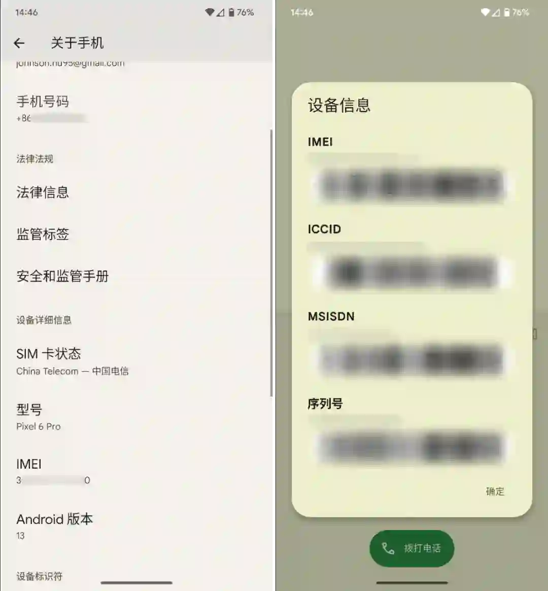 至于系统内报送的 IMEI,我们则有多种方法可以进行检查,比如在「系统设置 > 关于手机 > IMEI」中直接查看,再比如打开拨号应用、输入 *#06# 并拨号呼出「设备信息」面板等等。