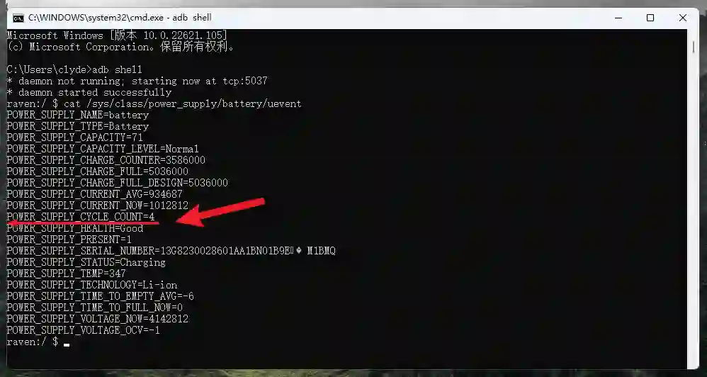 在命令行窗口列出的结果中,需要我们留意的是 POWER_SUPPLY_CYCLE_COUNT 这一项,这一项对应的是电池循环次数,数值越小,则设备经历过的完整电池充放周期约短,设备电池和设备本身的状况一般也越好。