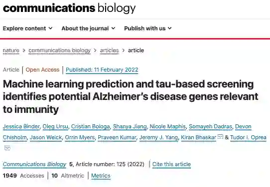 第二篇论文是2022年2月11日发表在Nautre comm上的文章“Machine learning prediction and tau-based screening identifies potential Alzheimer’s disease genes relevant to immunity”。