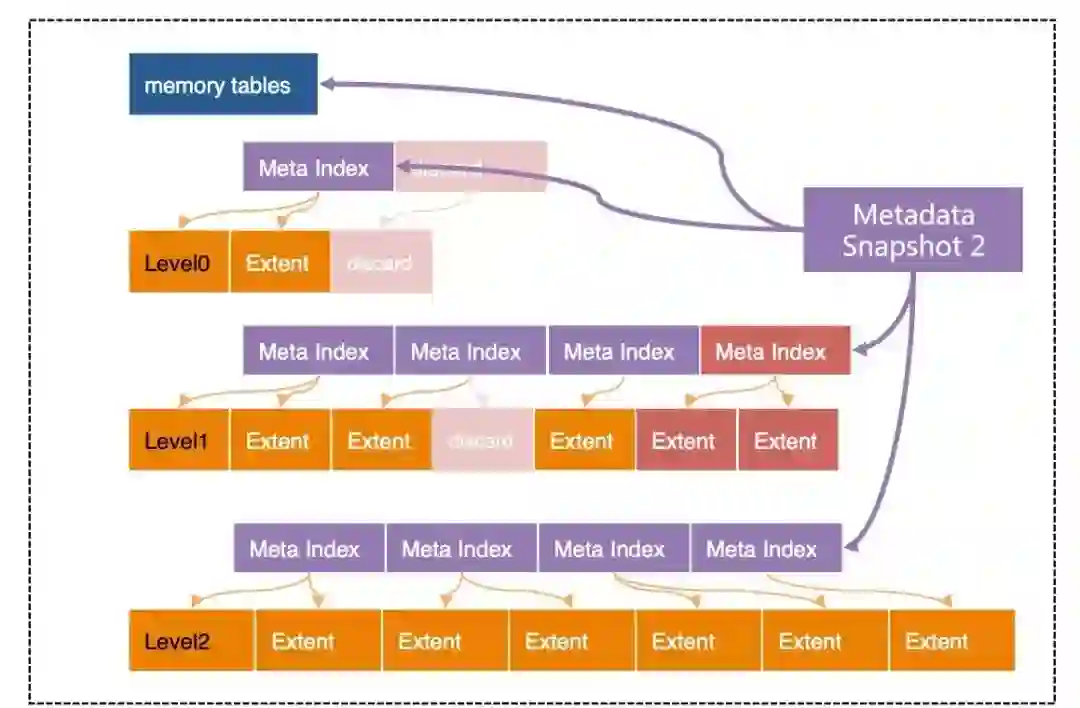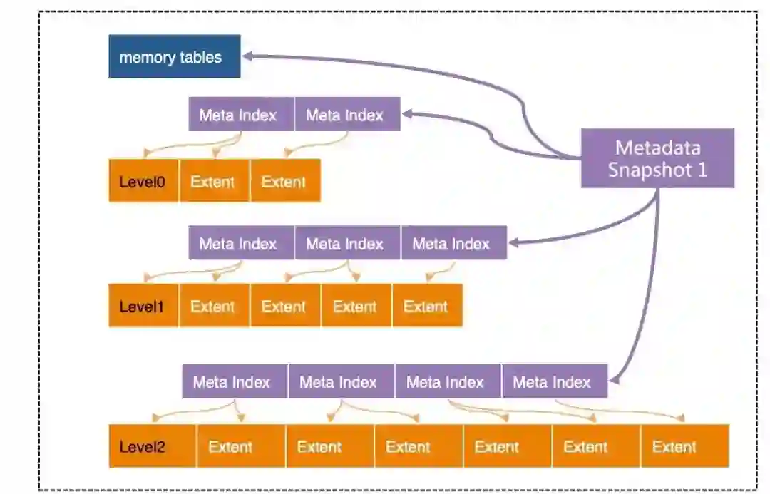 简单来说,X-Engine 的每层都划分成固定大小的 Extent,存放每个层次中的数据的一个连续片段(Key Range). 为了快速定位 Extent,为每层 Extents 建立了一套索引(Meta Index),所有这些索引,加上所有的 memory tables(active/immutable)一起组成了一个元数据树(Metadata Tree),root 节点为"Metadata Snapshot", 这个树结构类似于 B-Tree,当然不尽相同。