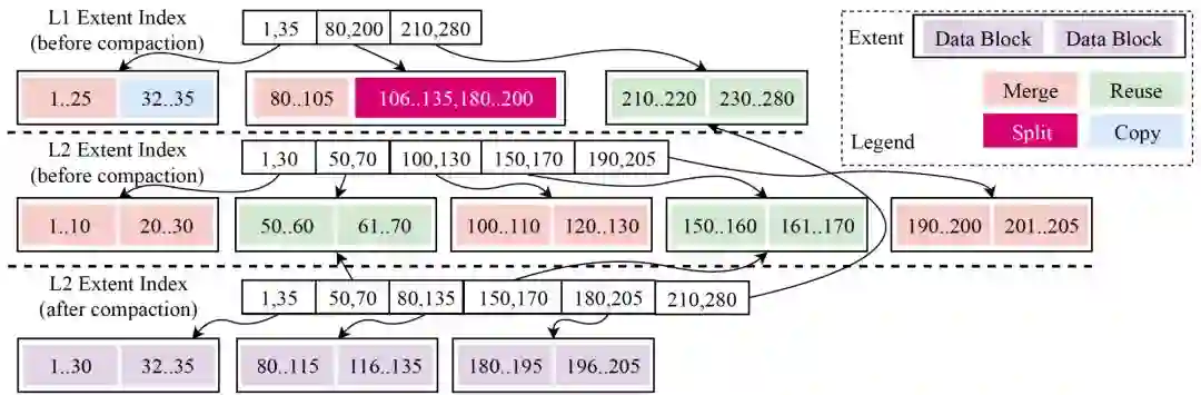 数据复用不仅给 compaction 操作本身带来了好处,降低操作过程中的 I/O 与 CPU消耗,更对系统的综合性能产生了一系列的影响。比如 compaction 过程中数据不用完全重写,大大减少了写入空间放大;更因为大部分数据保持原样,数据缓存不会因为数据更新而失效,减少合并过程中因缓存失效带来的读性能抖动。