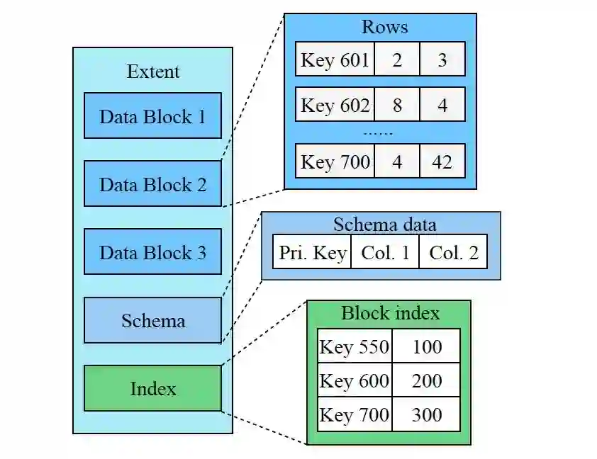 如前所述,X-Engine 将每一层的数据划分为固定大小的" Extent",一个 Extent 相当于一个小的完整的 SSTable, 存储了一个层次中的一个连续片段,其中又会被进一步划分一个个连续的更小的片段"Data Block",相当于传统数据库中的"Page",只不过是只读的,而且是不定长的。