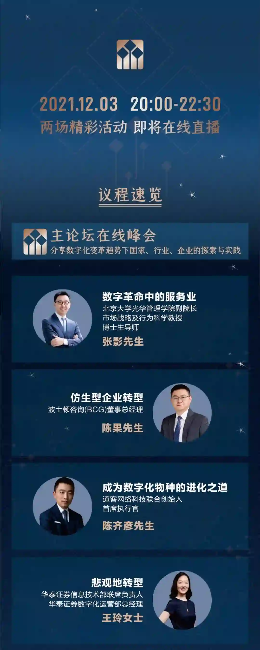 众说纷纭,我们究竟应该如何理解数字化转型?金融行业在数字化变革趋势下将走向何方?数字化转型前沿企业正在经历什么?12 月 3 日,2021 星空论坛将如期在线直播,邀请北京大学光华管理学院副院长、市场战略及行为科学教授、博士生导师张影;波士顿咨询(BCG)董事总经理陈果;道客网络科技联合创始人首席执行官陈齐彦以及华泰证券信息技术部联席负责人、华泰证券数字化运营部总经理王玲,探讨数字化转型浪潮下的金融行业发展方向。