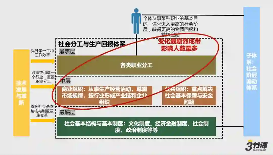 但,一个社会分工和生产回报体系中,到底会出现哪些“职业”,哪些职业可能会发生更替或消亡,却是由三层结构来决定的。