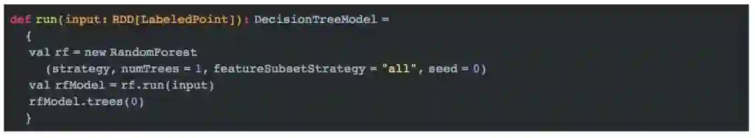 在MLlib中,决策树的实现和随机森林的实现是在一起的。随机森林实现中,当树的个数为1时,它的实现即为决策树的实现:
