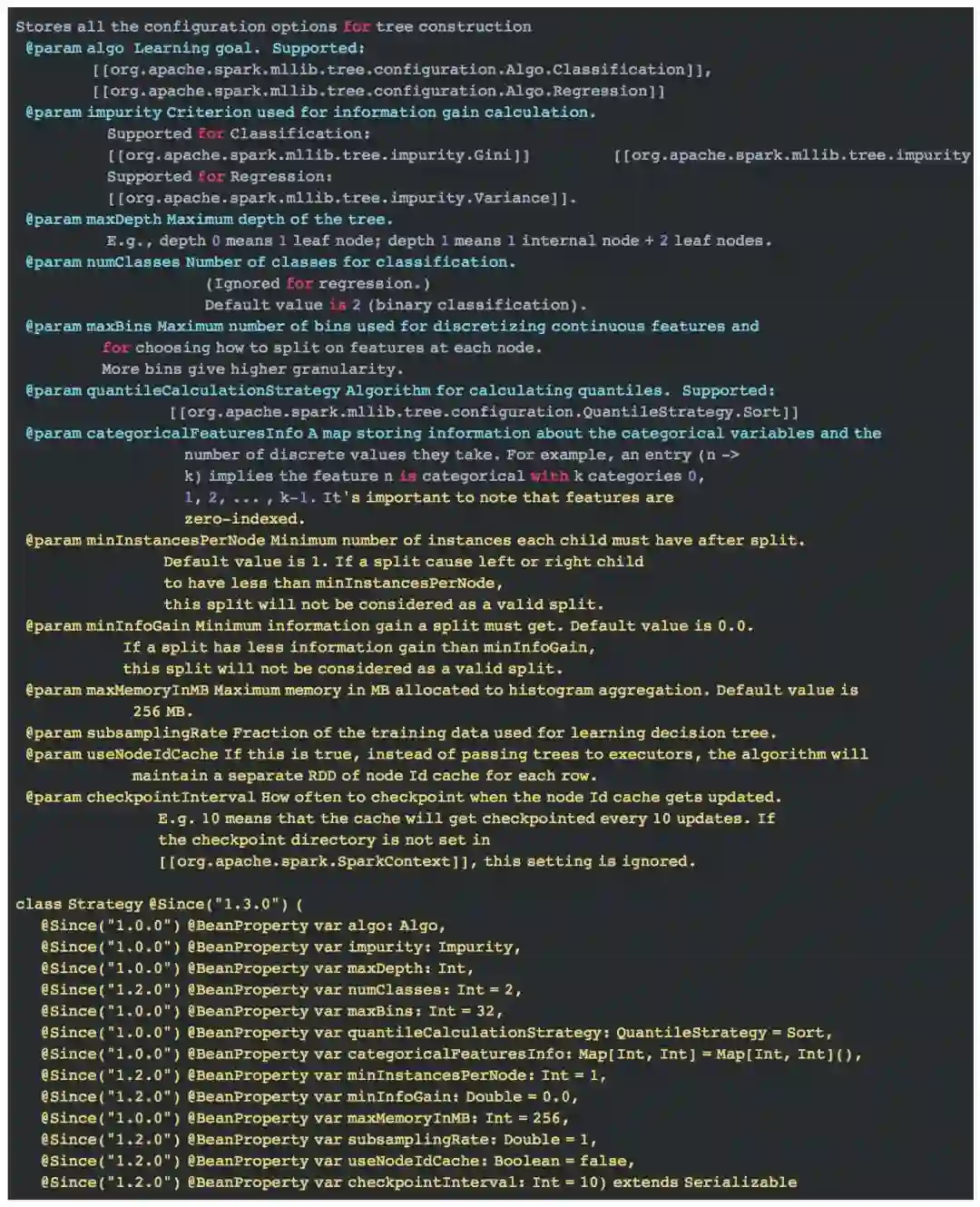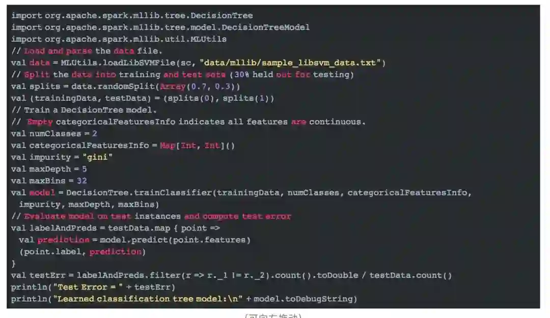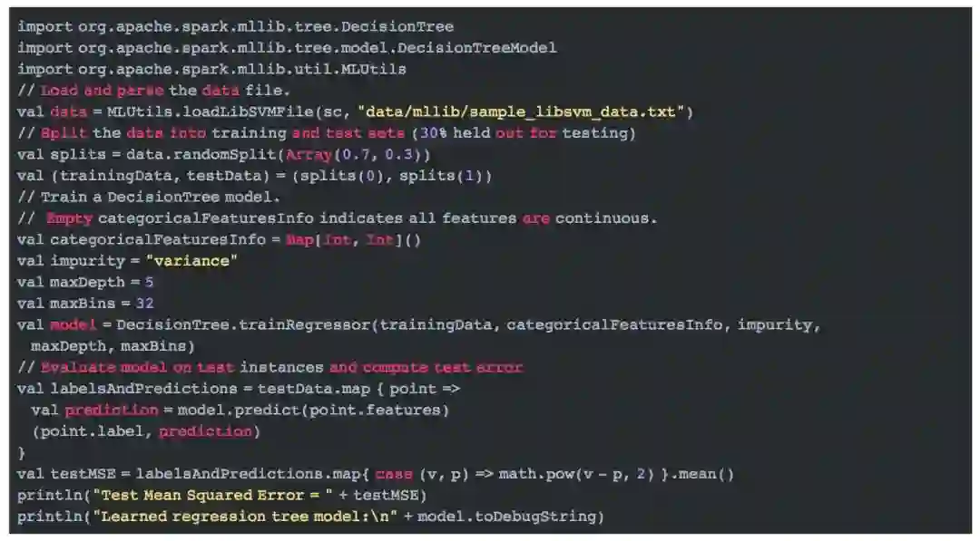 决策树的实现我们在随机森林专题介绍。这里我们只需要知道,当随机森林的树个数为1时,它即为决策树, 并且此时,树的训练所用的特征是全部特征,而不是随机选择的部分特征。即featureSubsetStrategy = "all"。