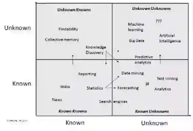 到目前为止,我们查询的目标是从所有噪音摸索有价值的信号。以掌握正确的信号,前提包括清晰的研究问题、数据规模较小、数据集更完整。前美国国防部长DonaldRumsfeld所谓的已知的已知(Known Knowns)和已知的未知(Known Unknowns)。Rumsfeld采用这概念讨论反恐情报的噪音,但也适用于分析和研究(请查看以下模式),做明智的业务决定。当然,“未知”的象限需要你的公司累计经验才可以比较进行有效探讨。