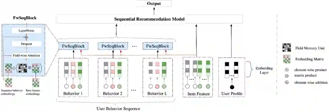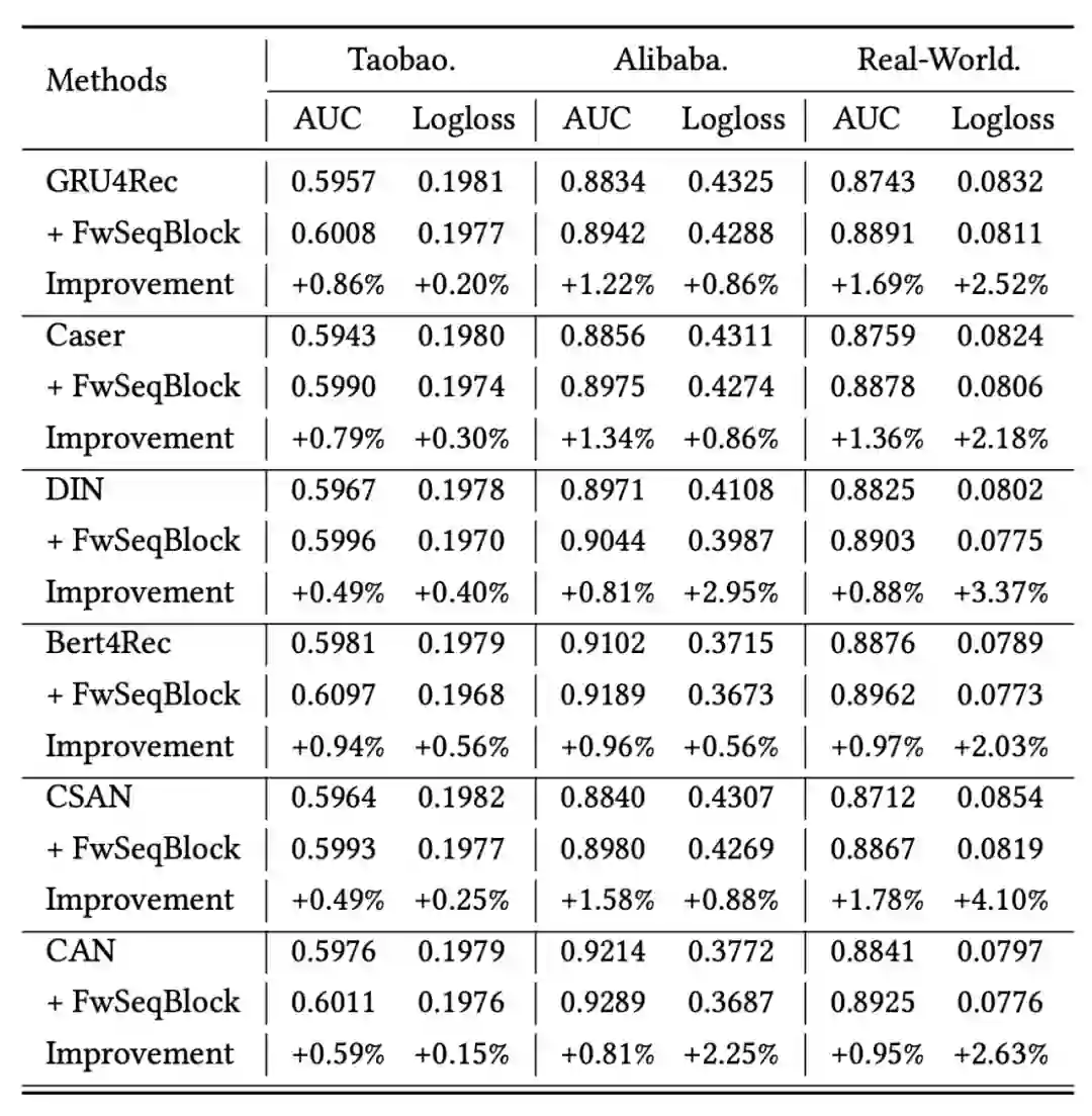 经过以上讨论,FwSeqBlock 聚焦于用户历史行为表征的生成中,具有可插拔的特点,因此可以很方便的与目前 SOTA 序列建模模型相结合。