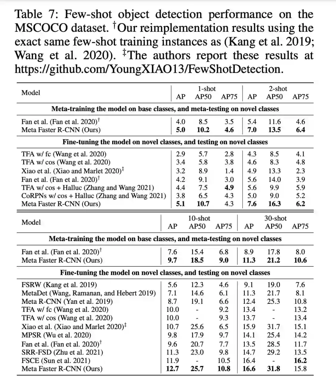 3. Fine-tuning with both base and novel classes:在前两个步骤中只采用 base 类数据,而在微调这一步中,会采用一个小型的平衡数据集,base 类和 novel 类都有。元学习和微调的关键区别在于,没有针对元学习 novel 类的训练。在元测试期间,我们只使用 novel 类的支持集来计算原型。支持图像是使用真实边界框注释从原始图像中裁剪出来的。在优化过程中,我们使用原始的 novel 类图像作为查询图像来优化我们的少数镜头检测器,包括 Meta-RPN 和 Meta 分类器。当我们逐渐使用更多图像进行微调时,novel 类的模型性能将得到改善。
