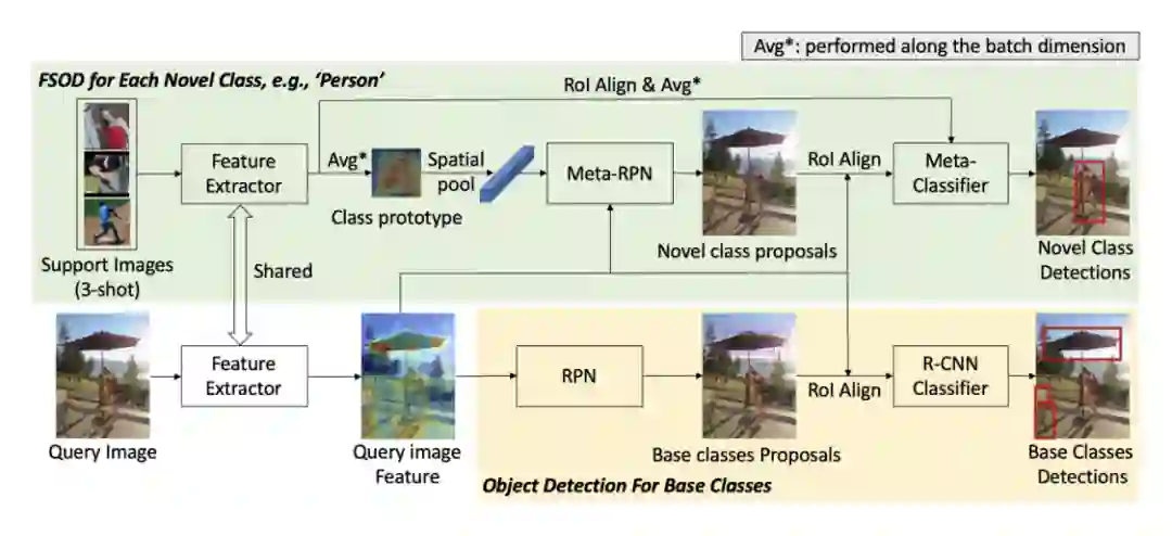 1. Meta-learning with base classes:从 base 类中标记一些类,这些类的支持图像为 K-shot,去模拟 FSOD 中 novel 类的学习情况。此外,作者还使用真实边界框对一些查询图像进行采样,并使用二元交叉熵损失和平滑 L1 损失进行模型训练。