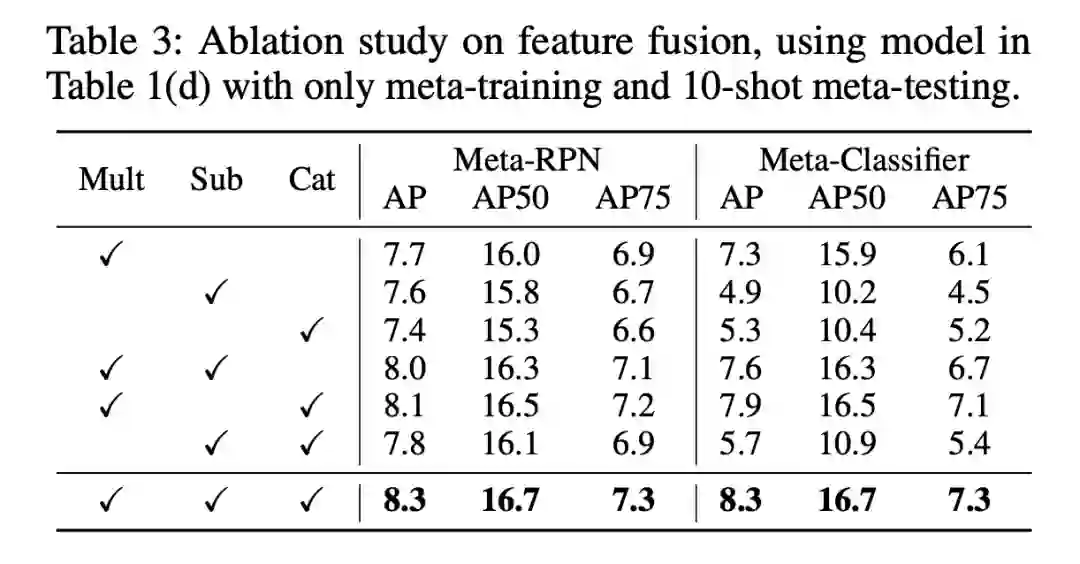 特征聚合模块的三项子网络做消融实验。直接使用 Cat 子网络并不能在元 RPN 和元分类器中获得良好的效果。这是因为 Cat 子网络试图直接学习两个特征之间的复杂融合,这不容易训练和泛化。