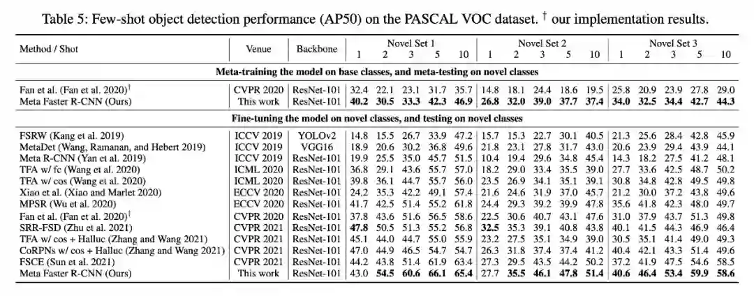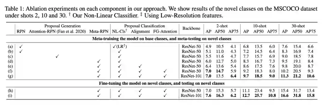 RPN、Attention-RPN 和 Meta-RPN 之间的比较,还有非线性分类器、对齐、前景注意力模块的使用,以及 backbone 为 101 层和 50 层,对实验结果的影响。