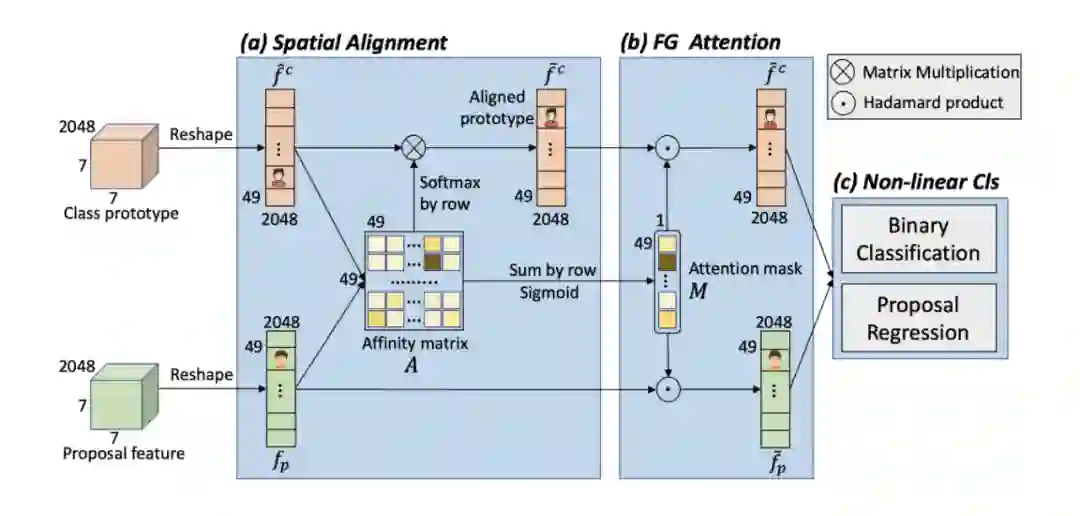作者首先通过计算相似度矩阵,在两个输入特征之间建立软对应关系,也就是孪生神经网络。然后,使用相似度矩阵计算与候选框一致的原型,并定位前景区域。最后再用非线性分类器去计算相似性分数。建议每个模块都对应下面的结构图看,理解公式。