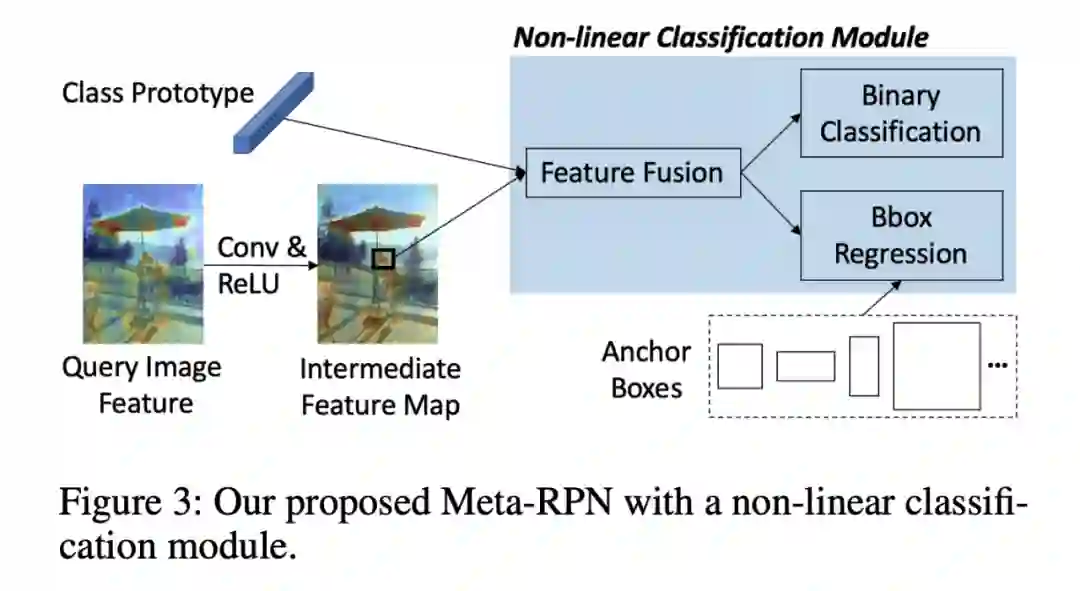 Meta-RPN 和普通 RPN 的比较:普通 RPN 主要区分出前景和背景,在 base 类数据上进行训练;Meta-RPN 将提取出来的特征和 novel 类的原型进行比较,看它们之间的相似性。二者作用都是筛选出候选框。