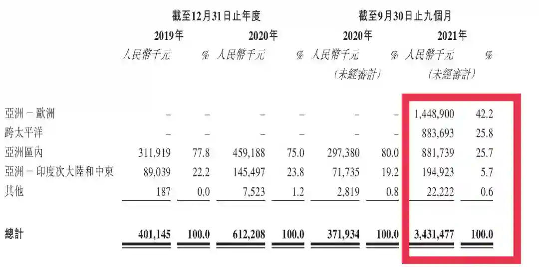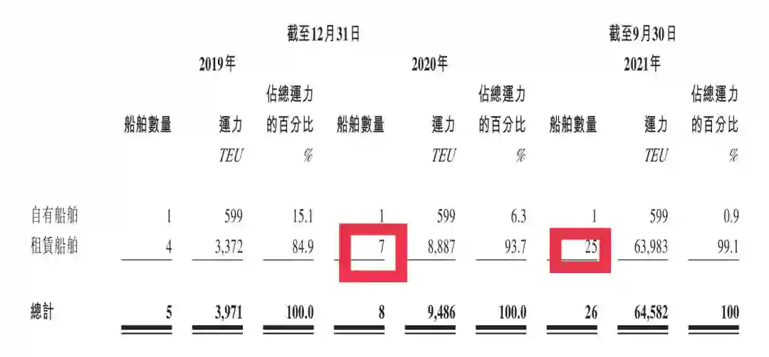 具体来说,其船舶数量从2020年的8艘增长到2021年9月的26艘,再到递交招股书时的33艘;运力也从2020年底的1.85万TEU(Twenty-feet Equivalent Unit,是以长度为20英尺的集装箱为国际计量单位)增长到近30万TEU,翻了15倍;航线拓展方面,增加亚洲—欧洲、跨太平洋的远洋航线,为了可以把货送到受供应链断裂影响更大的地方。