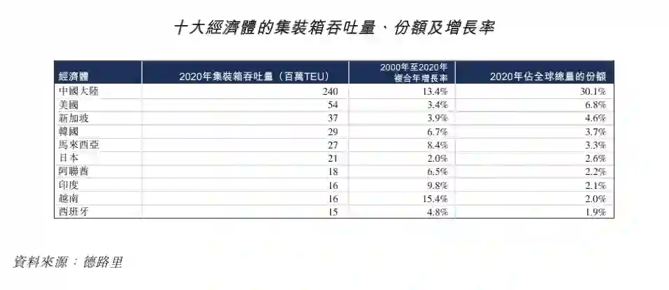 中国是全世界最大的集装箱制造国,全球生产的90%集装箱是中国制造。2020年,全世界约30.1%的集装箱吞吐量来自中国大陆港口,全球十大港口中中国大陆也占了六个。更重要的是,在新冠疫情发生之后,中国作为经济恢复较快的国家,出口相关的运输