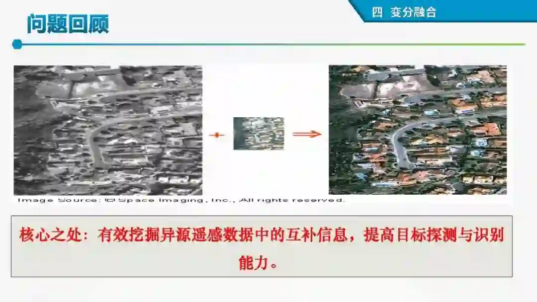 在像素级层次,图像融合可以缓解空间分辨率、时间分辨率、光谱分辨率之间的固有矛盾,获得更优的时-空-谱分辨率,获取更高质量数据;在特征和决策层面融合,可以获得更精细特征、更完备高层识别信息和知识。