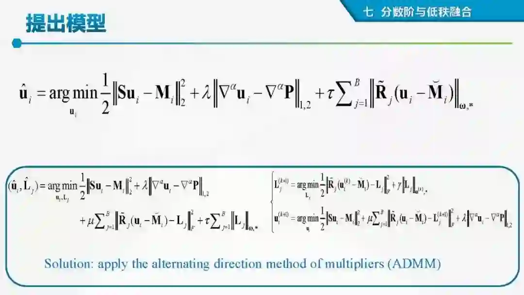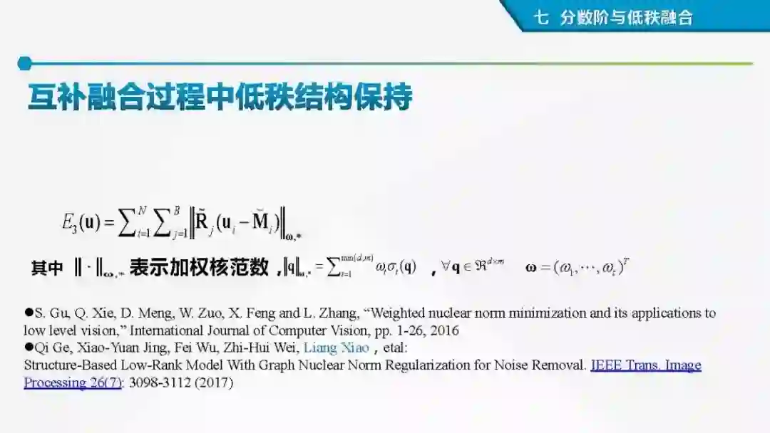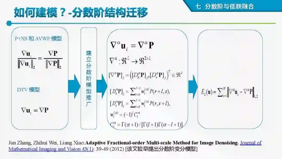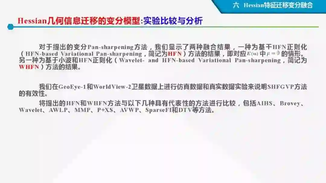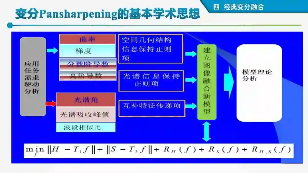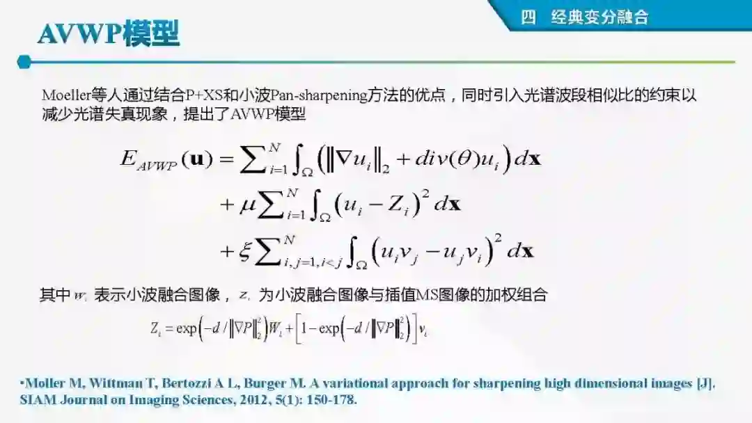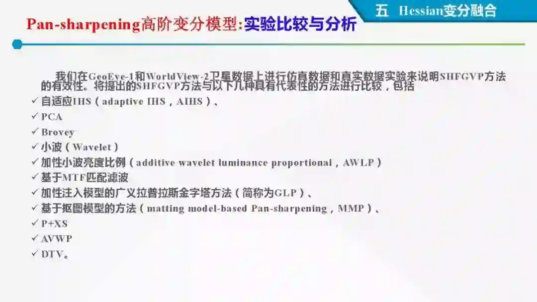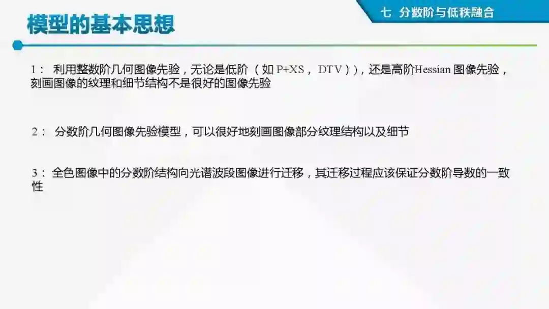 其中着重探索了一类基于变分模型的融合方法,这些方法背后的建模动机是将空谱图像融合建模为两路不完整(或欠采样)互补测量数据重建潜在图像的过程。重点论述变分融合计算体系与方法。其脉络涵盖低阶到高阶正则化,由整数阶到分数阶正则化的方法。