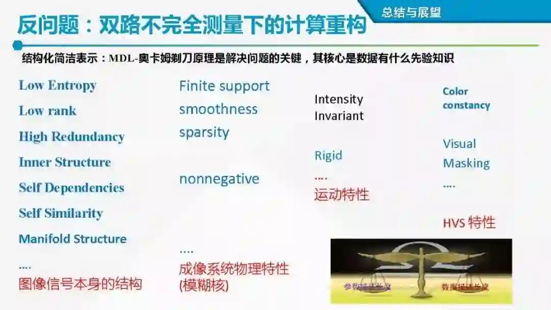 “如无必要,勿增实体” ,图像简洁而有效表示本质上折射一种“最短描述语言(MDL)”或者所谓的“奥卡姆剃刀”原理。从贝叶斯概率推理来看,由缺失和污染的观测数据空间到潜在数据空间,需要架起一座桥梁,而数据表示或先验建模是这座桥梁的基石。而从正则化观点来看,合理的先验模型(或正则化项)有助于缩小候选解的求解空间。