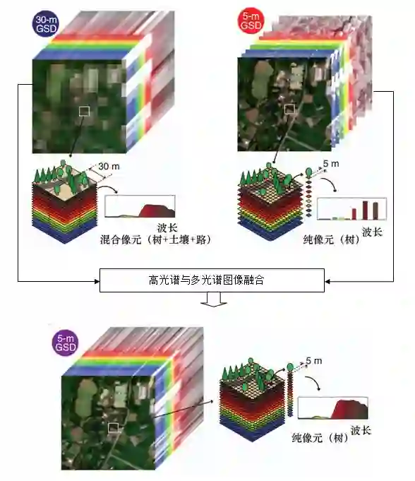 多源空谱遥感图像融合属于遥感数据融合领域的一支,包括像素级、特征级和决策级三个层次。多源空谱遥感图像融合是针对同一场景并具有互补信息的多幅遥感图像,充分挖掘内在的互补的相关空间几何结构、纹理、光谱和其他遥感特征信息等,通过对它们的处理、分析和利用,实现互补信息的综合集成。