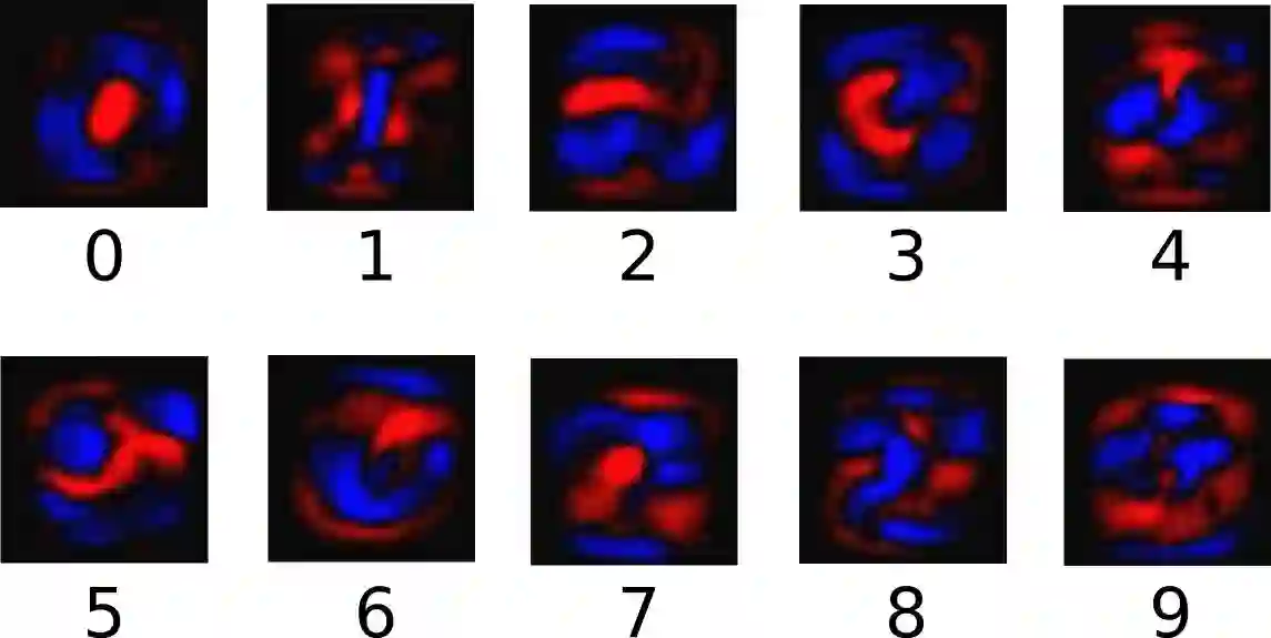 为了利用图片中各个像素点的信息,我们将图片中的各个像素点的值与一定的权值相乘并累加,权值的正负是有意义的,如果是正的,那么表示对应像素值(不为0的话)对表示该数字类别是积极的;否则,对应像素值(不为0的话)对表示该数字类别是起负面作用的。下面是一个直观的例子,图片中蓝色表示正值,红色表示负值(蓝色区域的形状趋向于数字形状):