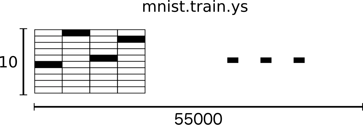 MNIST中的数字手写体图片的label值在1到9之间,是图片所表示的真实数字。这里用One-hot vector来表述label值,vector的长度为label值的数目,vector中有且只有一位为1,其他为0.为了方便,我们表示某个数字时在vector中所对应的索引位置设置1,其他位置元素为0. 例如用[0,0,0,1,0,0,0,0,0,0]来表示3。所以,mnist.train.labels是一个55000 * 10的二维数组。如下: