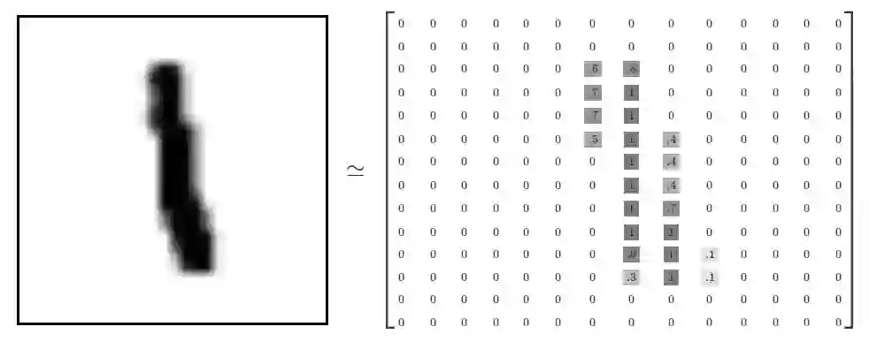 一张图片是一个28*28的像素点矩阵,我们可以用一个同大小的二维整数矩阵来表示。如下: