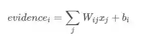 最后,我们在一个图片类别的evidence(不知如何翻译..)中加入偏置(bias),加入偏置的目的是加入一些与输入独立无关的信息。所以图片类别的evidence可表示为