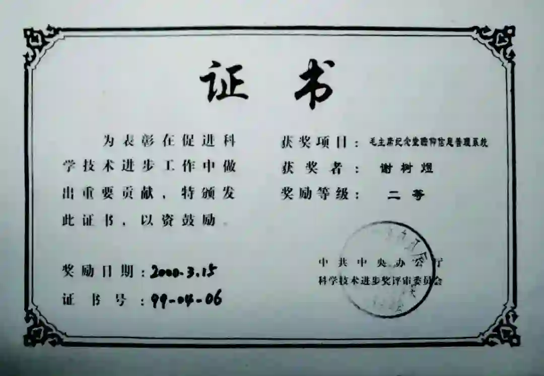 图5 谢树煜获“中共中央办公厅科技进步二等奖”证书