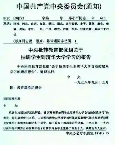 1958年9月,根据聂荣臻指示,中共中央办公厅与国防部第五研究院(以下简称“五院”)、第二机械工业部(以下简称“二机部”)、清华大学共同研究如何保障国家喷气技术和原子能事业发展的干部需要。据五院和二机部计算,1959年和1960年每年需要自动控制专业和电子计算机专业毕业生各250人。清华大学自动控制系两届学生加起来只有150人,不能满足国家事业发展需要。因此教育部党组专门报告党中央,请示从全国十所重点高校抽调高年级学生到清华大学自动控制系学习。事关国防建设,党中央领导十分重视。1958年9月15日,中国共产党中央委员会(通知),中发[58]792号、邓小平同志申613号文(见图3),批转了教育部党组关于抽调学生到清华大学自动控制系学习的请示报告,并通知有关省委部委望即执行。这个通知发送给陕西、河北、山西、江苏、浙江、湖北、四川省委邓小平、彭德怀、康生、聂荣臻、杨尚昆,及中宣、一机、二机、教育、冶金、军办,北京市委,共印26份。通知注明:彭真同志批,周恩来、陈云诸同志已阅。这件事是国家国防建设的重要事件,得到党中央领导高度重视。同时也说明党中央对清华大学自动控制系的关心和信任。