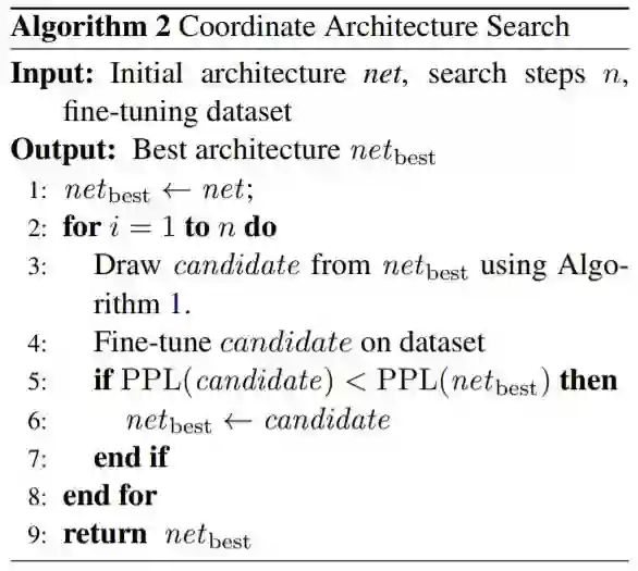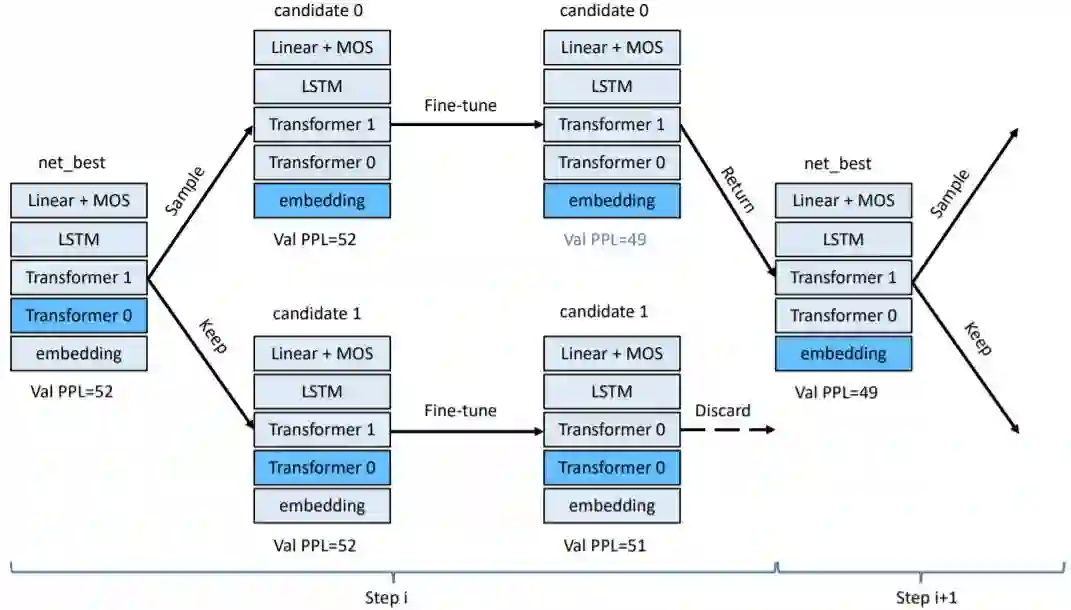 图 2:协调式架构搜索。net_best 是指搜索的第 i 步骤的最佳架构。我们采样搜索候选项,并保留表现最好的那个。我们的衡量指标是微调后在目标数据集上的困惑度(Val PPL)。参见算法 2。
