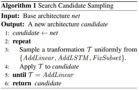 图 1:搜索候选项采样。图中 net 是指基础架构,candidate 是下一步骤返回的架构。Transformers、Embeddings、LSTM 和 Linear 是各种变换。其中颜色较浅的模块是可变的,深色模块是固定的。参见算法 1。