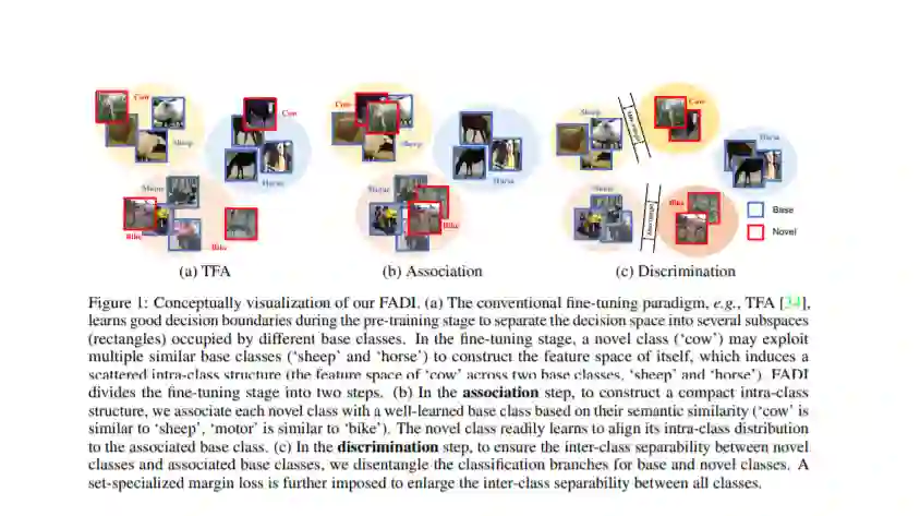 目标检测在过去的十年中取得了长足的进步。然而,利用少样本检测新类仍然具有挑战性,因为在低数据环境下的深度学习通常会导致特征空间的退化。现有的研究都采用了整体的微调范式来解决这个问题,即首先对模型进行大量样本的所有基类的预训练,然后用它来学习新的类特征空间。尽管如此,这种范式仍然是不完美的。在微调过程中,一个新类可能会隐式地利用多个基类的知识来构造其特征空间,导致特征空间分散,违反类间的可分离性。为了克服这些障碍,我们提出了一种两步微调的框架,即关联与识别的少样本目标检测(FADI),该框架采用两步整合的方法为每个新类建立判别特征空间。1) 在关联步骤中,与隐式利用多个基类不同,我们通过显式模拟一个特定的基类特征空间来构造一个紧凑的新类特征空间。具体来说,我们根据每个新类的语义相似度将它们与基类关联起来。之后,新类的特征空间可以很容易地模仿相关基类的经过良好训练的特征空间。2)在判别步骤中,为了保证新类和相关基类之间的可分离性,我们对基类和新类的分类分支进行解纠缠。为了进一步扩大各类别间的可分性,引入了一个集合化的保证金损失。在Pascal VOC和MS-COCO数据集上的大量实验表明,FADI实现了新的SOTA性能,在任何镜头/分割中显著提高了18.7的基线。值得注意的是,这种优势是在极少的场景中体现出来的。