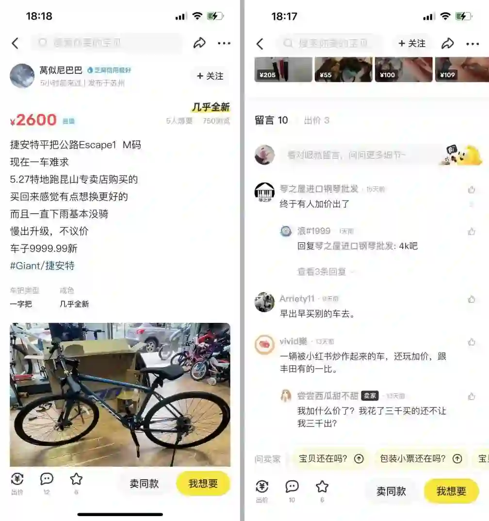 需求激增,线下门店缺货,自行车的多米诺骨牌推到了二手平台上。如,原价2598元的escape1,有卖家卖二手甚至高于原价。