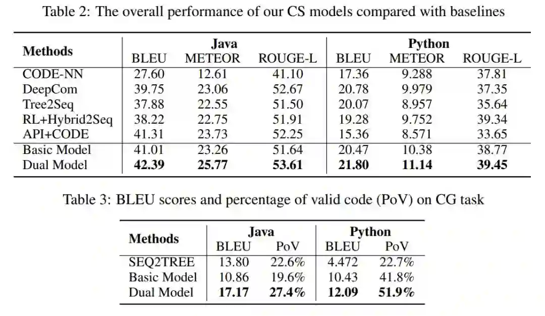 如上所示为代码生成与总结的总体效果,我们可以发现对偶训练效果要超过其它方法,且相比独立训练的 Basic Model,效果也要更好一些。