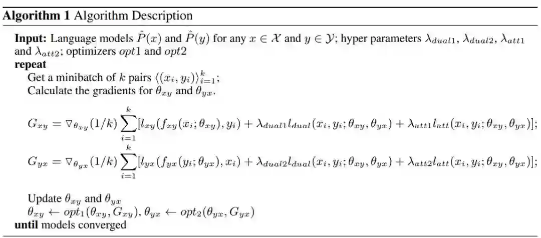 现在两种正则项都已经完成了,只需要联合训练两个子模型就行了。如下算法 1 所示,输入两种数据源的语言模型预计对应的数据,模型就能开始学。