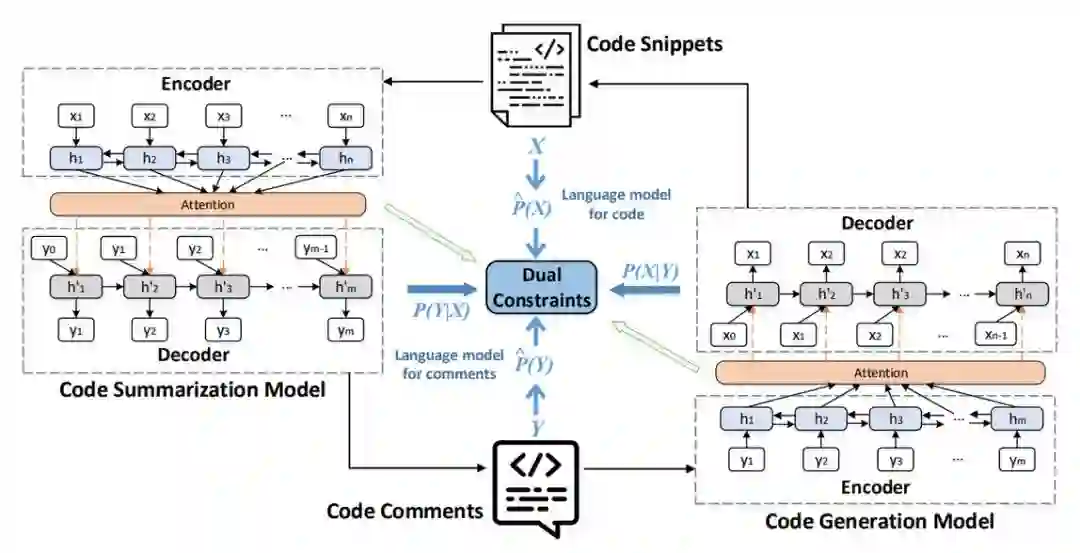 之前这两项研究大多都是独立的,代码总结会利用 Encoder-Decoder、抽象语法树和 Tree RNN 等技术生成意图,代码生成会利用 Seq2Seq、语法规则和基于语法的结构化 CNN 来生成代码,这些研究并没有深入挖掘它们之间的关系。